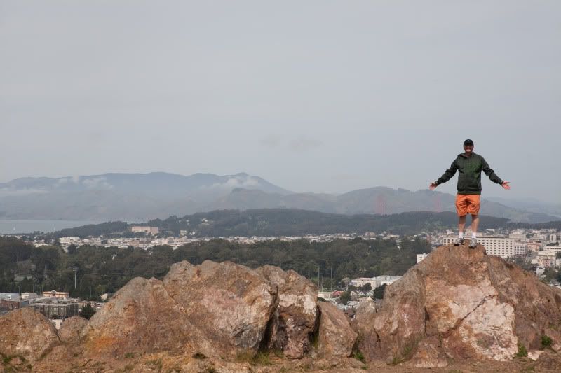 Today we decided to climb Mount Sutro. It was on my list of things to do this year. On the way down we found Tank Hill Park. It had amazing views and a few rocks to stand on. It's 650 Ft. above sea level and looks down over pretty much the whole city. This is me doing my impression of the Christ the Redeemer Statue in Brazil. You can see The Golden Gate Bridge just below my right hand.
