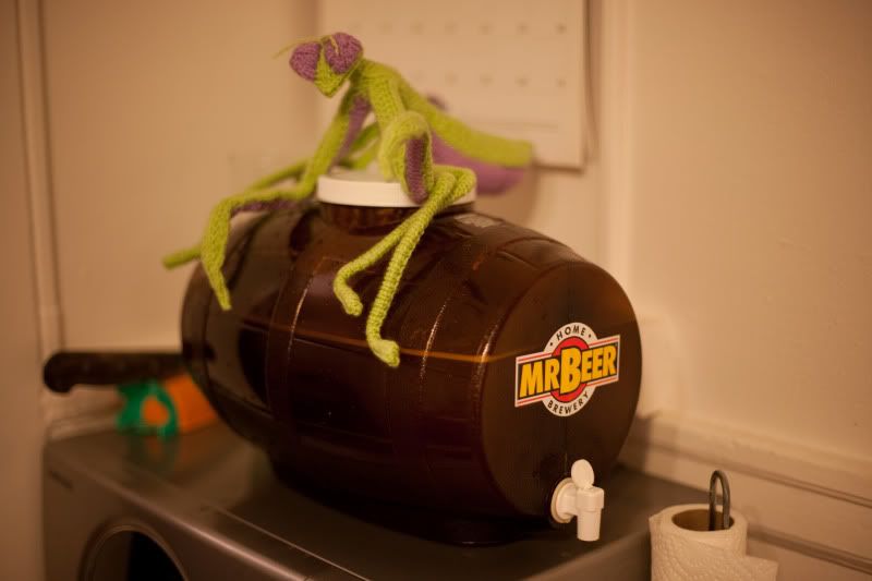 The other day Donna and I brewed the beer kit she got me for my birthday. We boiled up the wort and put it in Mr. Beer. It needs to sit for 2 weeks before it's bottled so we put the knitted mantis on it to protect it. We don't want anyone stealing our 2 gallons of beer before it's ready.